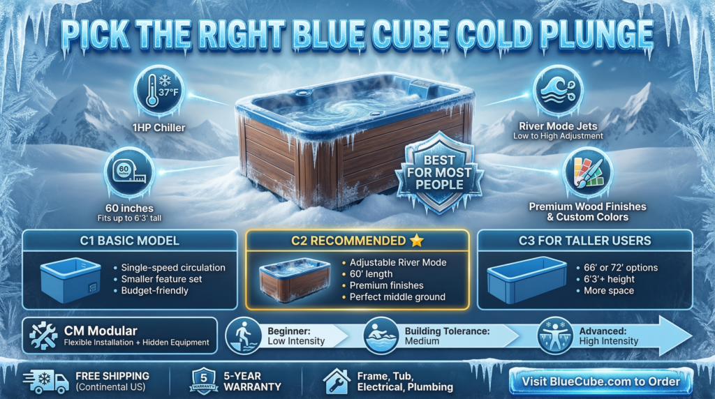 If you want the most straightforward “buy once, use for years” Blue Cube setup, the C1 is the cleanest entry point—commercial-grade cooling, low-maintenance water care, and a shell built for real outdoor life. View current pricing, shipping, and color options here: